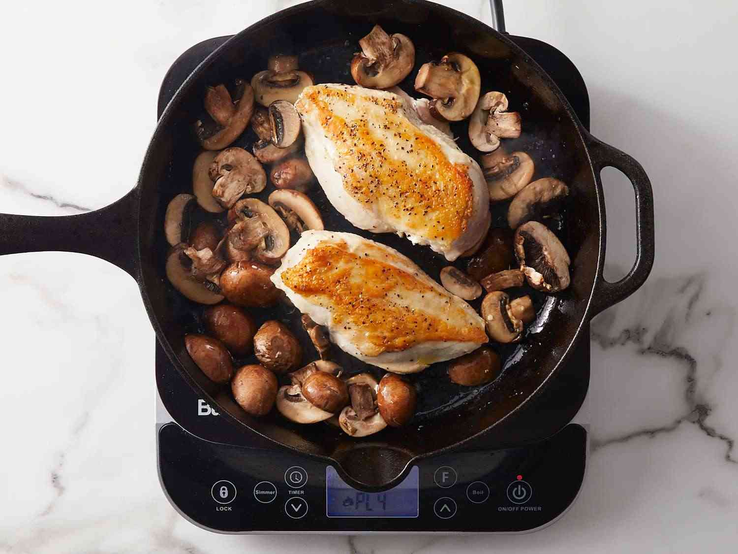 - Step 5:Turn chicken over; stir mushrooms with a pinch of salt into skillet. Increase heat to high; cook, stirring mushrooms occasionally, until mushrooms shrink slightly, about 5 minutes. Dotdash Meredith Food StudiosDotdash Meredith Food Studios