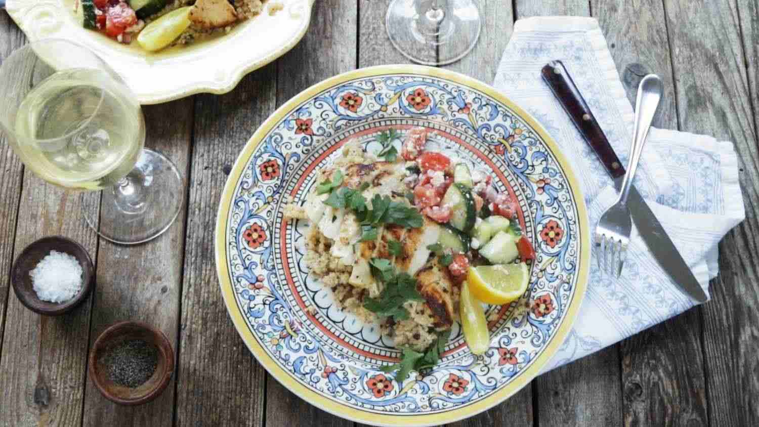 - Step 6:Drizzle remaining dressing over couscous and fold in olives. Divide couscous among four plates. Slice chicken breasts and place over couscous. Serve tomato salad on the side. Garnish the dish with parsley.