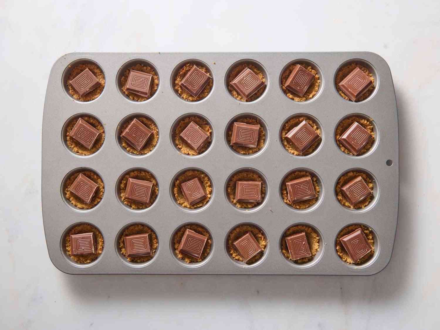 - Step 4:Break each chocolate bar into 12 equal pieces; place one piece into each graham cracker cup. Allrecipes/Julia Hartbeck